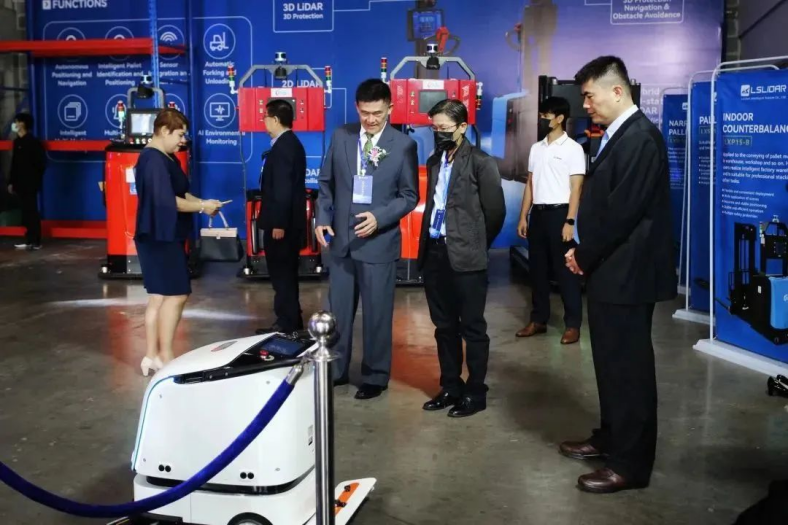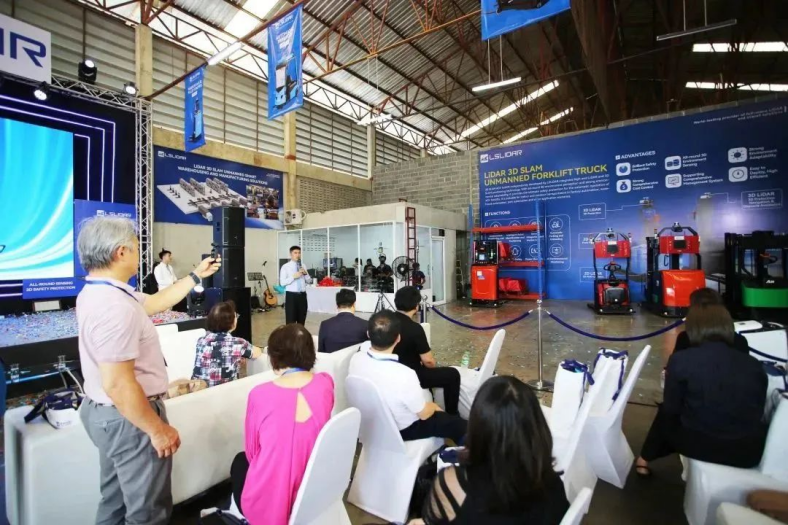 在现场,为现场嘉宾更好的感受无人叉车的性能与应用情况,同国内一样也布置了“动态演示区”与“静态展示区”,让泰国的领导与客户们更深切的了解镭神智能激光雷达3D SLAM无人叉车其自然定位导航、全方位3D安全防护及智能搬运能力。