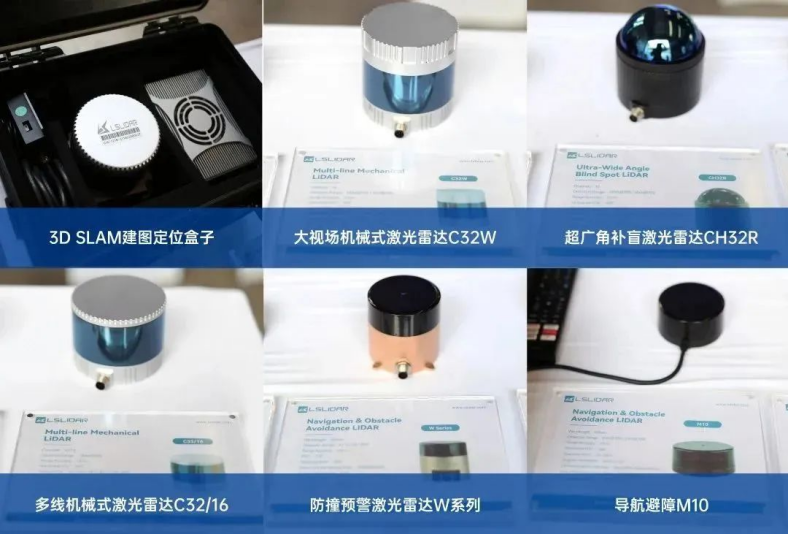 此外,激光雷达作为镭神智能3D SLAM无人叉车重要的传感硬件也亮相于活动现场:用于3D 立体防护的大视场机械式激光雷达C32W、用于3D 立体防护&定位导航的多线机械式激光雷达C32/16、用于2D防撞的防撞预警激光雷达W系列、用于叉尖防护的导航避障的M10、以及用于3D 立体防护&栈板识别的车规混合固态激光雷达CH128X1的点云视频以及用于三维立体建图的3D SLAM定位盒子。