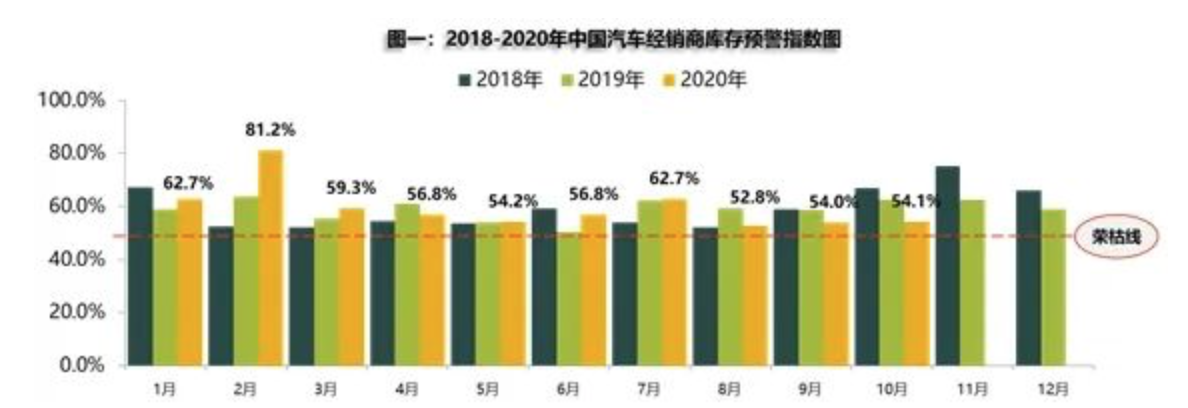 2020年10月31日,中国汽车流通协会发布的最新一期“中国汽车经销商库存预警指数调查”VIA(Vehicle Inventory Alert Index)显示,2020年10月汽车经销商库存预警指数为54.1%,较上月上升了0.1个百分点,较去年同期下降了8.3个百分点,库存预警指数位于荣枯线之上。