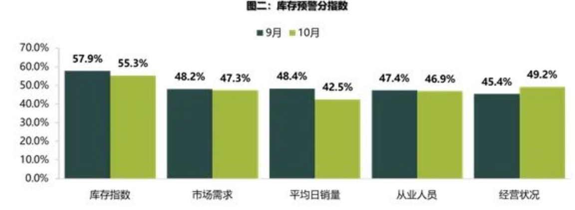 从分指数情况看:10月份库存指数、市场需求指数、平均日销量指数、从业人员指数环比下降,经营状况指数环比上升。