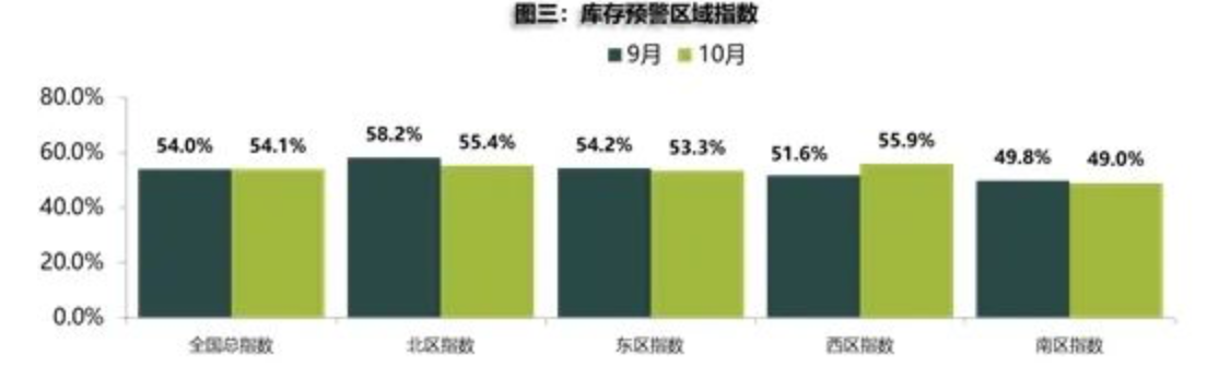 从区域指数情况看:10月份全国总指数为54.1%,北区指数为55.4%,东区指数为53.3%,西区指数为55.9%,南区指数为49.0%。南区延续涨势,库存压力缓和,西区新疆疫情反复,客流和销量回落。