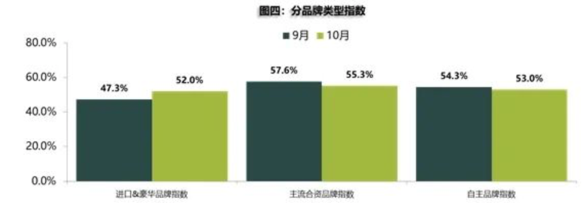 从分品牌类型指数看:10月份进口&豪华品牌指数环比上升,主流合资品牌,自主品牌指数环比下降。各品牌进入年末补库阶段,豪华品牌销量小幅下滑,库存压力有所增加。