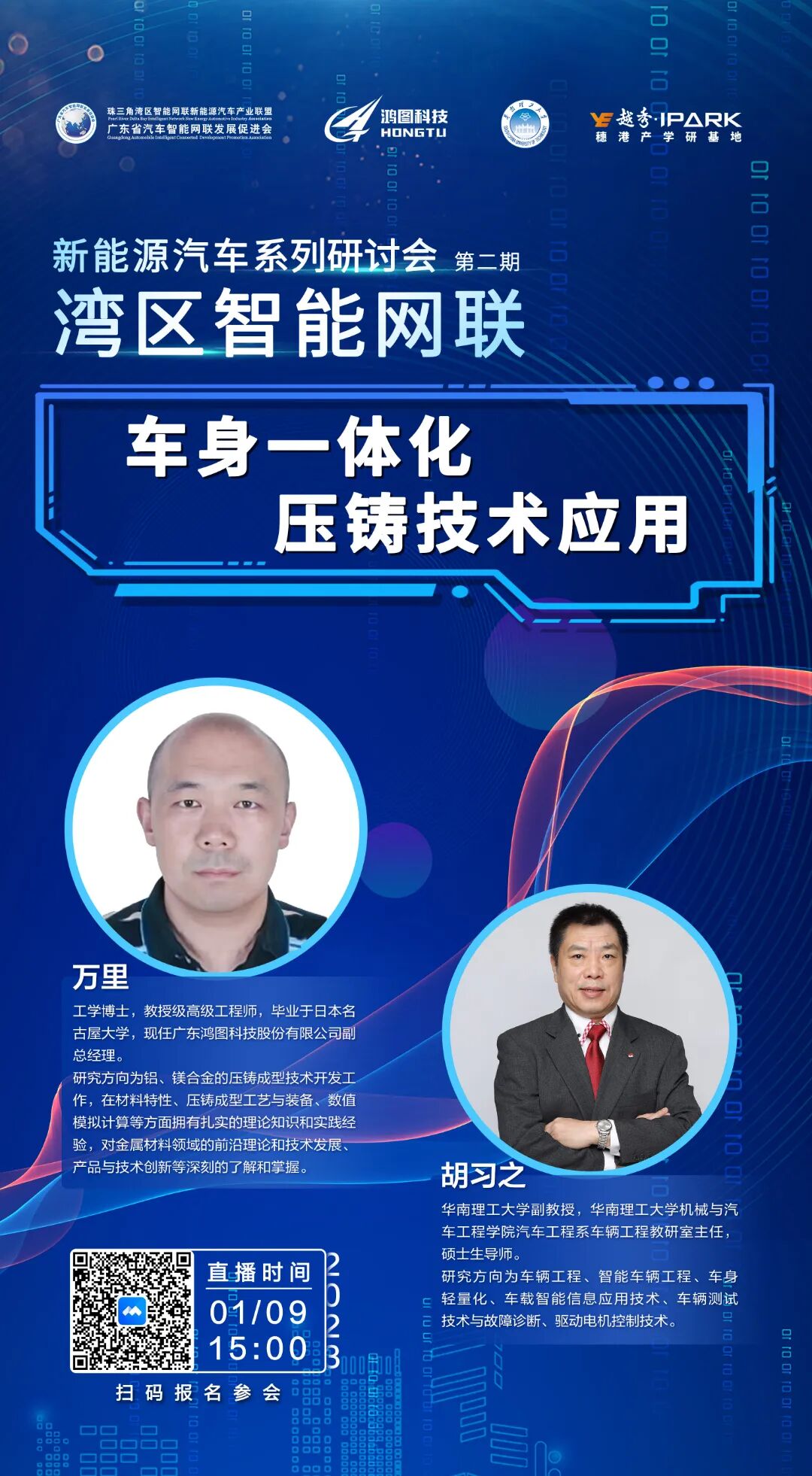 万里,工学博士,教授级高级工程师,毕业于日本名古屋大学,现任广东鸿图科技股份有限公司副总经理。万里同志长期专注于铝、镁合金的压铸成型技术开发工作,在材料特性、压铸成型工艺与装备、数值模拟计算等方面拥有扎实的理论知识和实践经验,对金属材料领域的前沿理论和技术发展、产品与技术创新等深刻的了解和掌握。开展了多项如高真空压铸技术、机器人自动除毛刺技术、数控加工自动化生产线的开发,使公司的生产技术水平达到国际先进水平。同时开展了汽车车身/底盘结构件的同步设计、技术开发和生产,产品质量达到国际领先水平,促进国内汽车轻量化技术的发展。近年来,承担和完成了广东省科技厅产学研项目6项,其中重大专项1项。获得肇庆市科技进步奖2项。在国内外核心期刊上发表论文60余篇,获得发明专利10余项,其中作为核心技术拥有者的发明专利7项。主编教材1本,参编教材2本,合作著作2本。