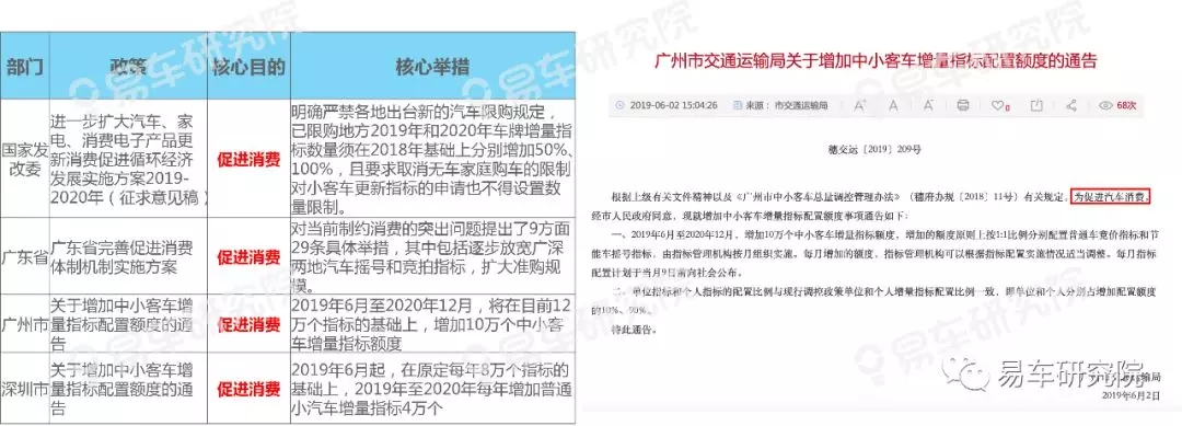为促进消费,2019年4月国家发改委正式回应《进一步扩大汽车、家电、消费电子产品更新消费促进循环经济发展实施方案2019-2020年(征求意见稿)》;5月底广东率先发布《广东省完善促进消费体制机制实施方案》,逐步放宽广深两地汽车摇号和竞拍指标,扩大准购规模;6月初广州、深圳具体出台《关于增加中小客车增量指标配置额度的通告》……各级政府正紧锣密鼓出台放宽汽车限购的政策