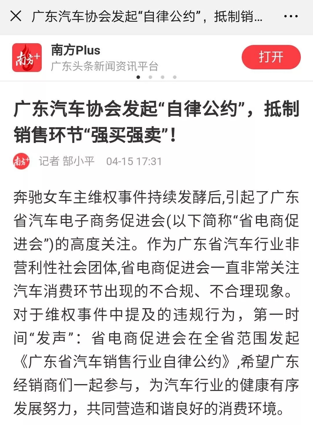 链接2:针对维权事件,4月15日,我会率先发起行业“自律公约”,由南方日报 发布文章“广东汽车协会发起‘自律公约’!”报道。