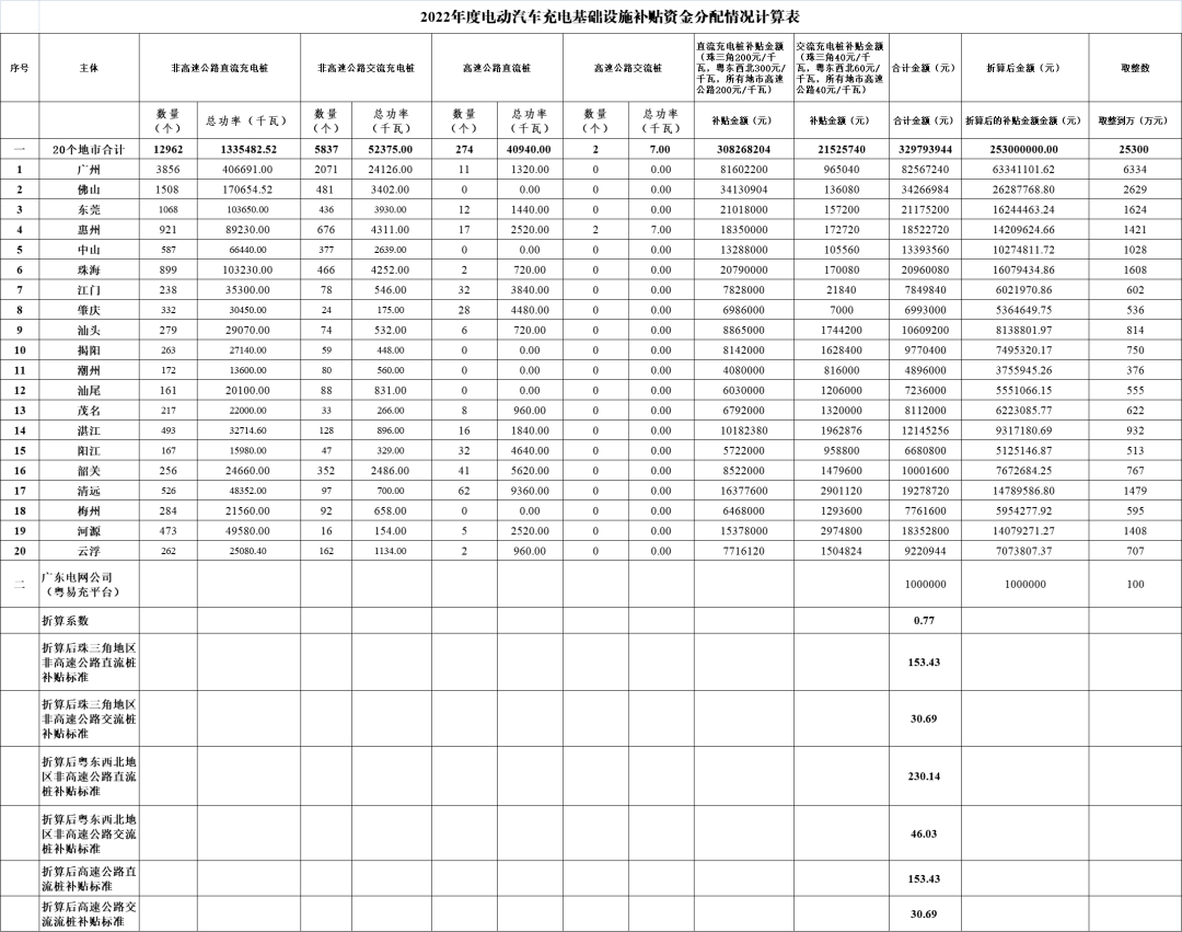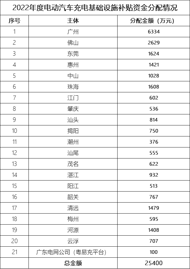 为进一步支持电动汽车充电基础设施建设,按照《广东省财政厅 广东省能源局关于印发省能源局经管节能降耗和充电基础设施建设专项资金管理办法的通知》(粤财工〔2020〕40号)有关要求,我局根据各地市(不含深圳市)、省交通运输厅报送的建成投运、验收合格并于2022年取得粤易充平台接入证明的公共充电桩数量和额定功率数,按照“锁定预算、总额控制”原则,采用因素法切块,编制了我省2022年度电动汽车充电基础设施补贴资金分配计划。本次分配总金额为2.54亿元,涉及我省20个地市(不含深圳市)和广东电网公司粤易充平台,现将资金分配计划予以公示(见附件)。