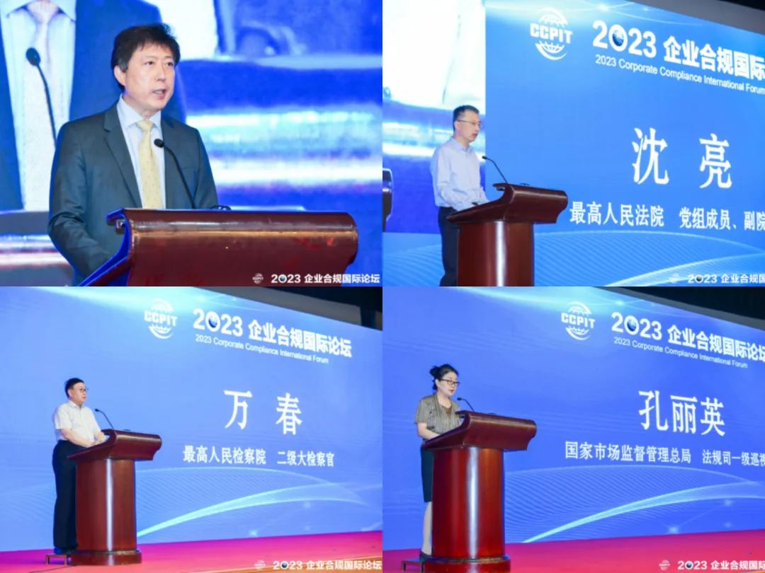 7月26日,2023企业合规国际论坛在北京举办。中国国际贸易促进委员会副会长于健龙,最高人民法院副院长沈亮,最高人民检察院二级大检察官万春,国家市场监督管理总局法规司一级巡视员孔丽英出席论坛并致辞。