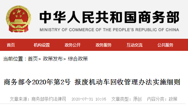 《报废机动车回收管理办法实施细则》已经本届商务部第25次部务会议审议通过,并经发展改革委、工业和信息化部、公安部、生态环境部、交通运输部、市场监管总局同意,现予公布,自2020年9月1日起施行。