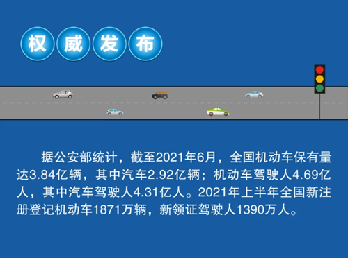 据公安部统计,截至2021年6月,全国机动车保有量达3.84亿辆,其中汽车2.92亿辆;机动车驾驶人4.69亿人,其中汽车驾驶人4.31亿人。2021年上半年全国新注册登记机动车1871万辆,新领证驾驶人1390万人。