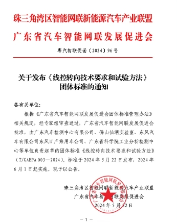 根据《广东省汽车智能网联发展促进会团体标准管理办法》相关规定,经专家组审查通过,广东省汽车智能网联发展促进会批准,由广东汽车检测中心有限公司、佛山仙湖实验室、东风汽车有限公司东风日产乘用车公司、广东省科学院工业分析检测中心等单位负责起草的团体标准《线控转向技术要求和试验方法》(T/GAEPA003-2024)。标准于2024年5月22日发布,2024年6月1日起实施。现予以公告。