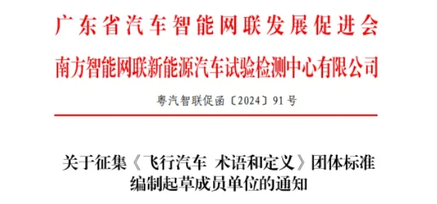 由南方(韶关)智能网联新能源汽车试验检测中心有限公司(以下简称“南方试验场”)牵头提案的《飞行汽车 术语和定义》已在全国标准化平台正式获批立项,该团体标准由广东省汽车智能网联发展促进会归口并发布。为进一步发挥行业骨干单位在标准研究与制定领域的主体作用,充分统筹行业优势资源,确保标准制定更具科学性、专业性及实用性,贴近产业特点及行业发展需求,现面向社会征集团体标准编制成员单位,共同参与标准制定工作。现将有关要求及相关事项通知如下: