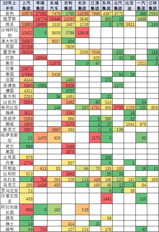 从集团的出口表现来看,2022年上半年,上汽集团在智利市场、埃及市场、沙特市场、澳大利亚市场、英国市场、墨西哥市场、印度市场、泰国市场等表现都是极其强势良好的态势。而奇瑞汽车在智利市场、俄罗斯市场和埃及市场表现都极其的优秀,长城汽车在俄罗斯市场和南非市场以及部分其他市场表现也是极其良好的态势。