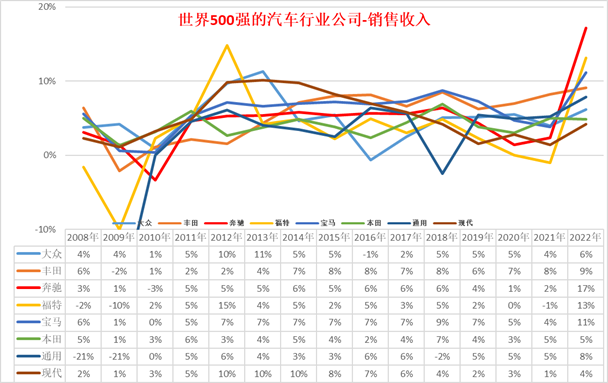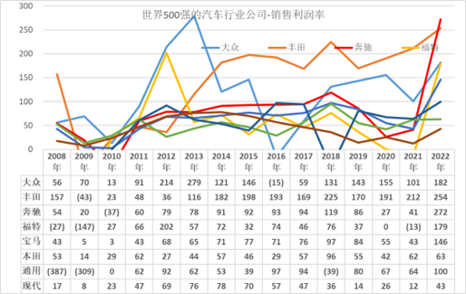 主力车企的利润在发生重大的变化,波动性极其剧烈,尤其可以看到像大众汽车等利润变化相对较大。2013年大众汽车达到279亿美元的利润水平,随后进入于调整,至2016年出现亏损15亿美元的变化,而到目前又呈现持续增长态势,2022年达到182亿美元的良好水平。
