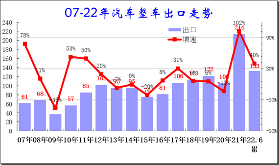2022年中国汽车出口表现很强,1-6月实现出口133万台,同比增长40%的良好增速是很好的。