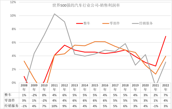 2022年汽车整车的销售利润率突破了7%的水平,达到了历史的高位的水平,而汽车零部件的利润也保持在相对较好的状态。经销行业利润目前是属于偏低的状态,这也是受到疫情的严重影响,所以目前来看,整车汽车行业目前表现是最为优秀的。