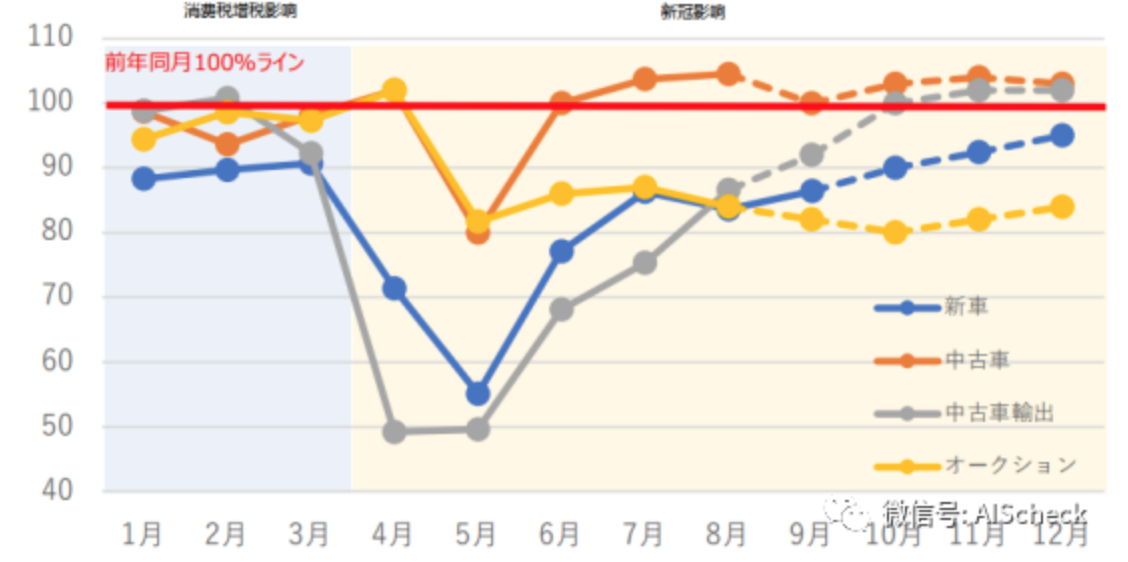 正如上一节所述,虽然新车销售订单与去年比显著提高,但重要的是新车登记量来看仅达到去年80%持续低迷。现在置换车(二手车)数量较少,二手车市场出现了罕见的库存不足。想要新车登记量恢复去年同期水平,至少要等到今年年底,那么二手车的供给平衡会在明年年初恢复。