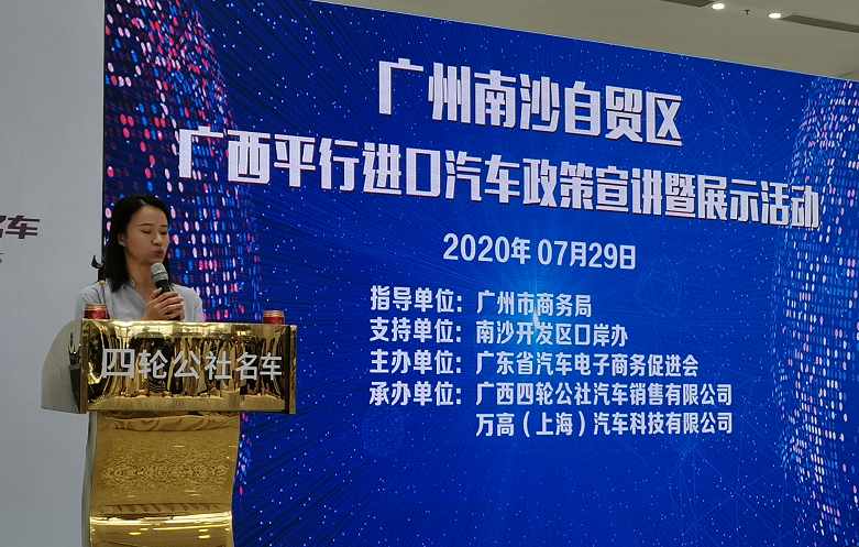 2020年7月29日,由广州市商务局指导,南沙经济技术开发区口岸工作办公室支持,广东省汽车电子商务促进会主办,广西四轮公社汽车销售有限公司、万高(上海)汽车科技有限公司承办的南沙自贸区汽车平行进口政策宣讲暨展示活动在广西南宁会展中心成功举办。出席人员有南沙开发区口岸办、南沙海关、广东省汽车电子商务促进会、广西商协会相关负责人以及来自广东、广西的平行进口车经销商代表60余人。
