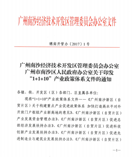 【重磅发布】南沙 穗南开管办〔2017〕1号——关于印发“1+1+10”产业政策体系文件的通知