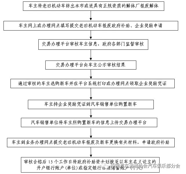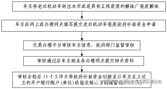 具体办理流程。车主完成老旧机动车报废解体或转出后,通过交易办理平台(http://www.bjtgc.com.cn)或办理网点申请获得企业奖励凭证,更换新车时使用企业奖励凭证冲抵车款的方式获得企业奖励,但所购新车车型必须是交易办理平台公示的车型,新车车型不包括摩托车及低速载货机动车。车主在新车注册登记后,再回网上或办理网点办理政府补助资金领取手续。如车主承诺只报废或转出老旧机动车,但购置不在交易办理平台上公示的新车,交易办理平台审核后直接发放政府补助。