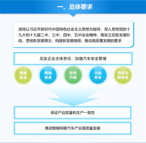 一是明确管理范围、强化企业主体责任。《意见》明确管理范围为智能网联汽车生产企业及其产品。智能网联汽车是指搭载先进的车载传感器、控制器、执行器等装置,融合现代通信与网络、人工智能等技术,实现车与X(车、路、人、云等)智能信息交换、共享,具备复杂环境感知、智能决策、协同控制等功能,可实现“安全、高效、舒适、节能”行驶,并最终可实现替代人来操作的新一代汽车。《意见》明确企业应落实主体责任,加强汽车数据安全、网络安全、软件升级、功能安全和预期功能安全管理,保证产品质量和生产一致性。