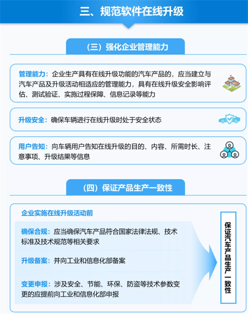 三是规范软件在线升级。《意见》明确企业生产具有在线升级功能的汽车产品的,应当建立与汽车产品及升级活动相适应的管理能力。企业实施在线升级活动前,应当确保汽车产品符合法律法规、技术标准及技术规范等相关要求,并向工业和信息化部备案。升级涉及技术参数变更的,要求企业应提前按照《道路机动车辆生产企业及产品准入管理办法》(以下简称《管理办法》)办理变更手续。要求在线升级活动保证产品生产一致性。明确未经审批,不得通过在线等软件升级方式新增或更新汽车自动驾驶功能。