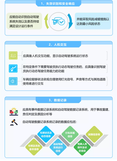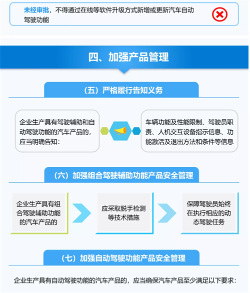 四是加强产品管理。《意见》提出企业生产具有驾驶辅助和自动驾驶功能的汽车产品的,应当明确告知车辆功能及性能限制、驾驶员职责、人机交互设备指示信息、功能激活及退出方法和条件等信息。企业生产具有组合驾驶辅助功能的汽车产品的,还应采取脱手检测等技术措施,保障驾驶员始终在执行相应的动态驾驶任务。企业生产具有自动驾驶功能的汽车产品的,应当确保汽车产品至少满足系统失效识别与安全响应、人机交互、数据记录、过程保障和模拟仿真等测试验证的要求。应当确保汽车产品具有安全、可靠的时空信息服务,鼓励支持接受北斗卫星导航系统信号。