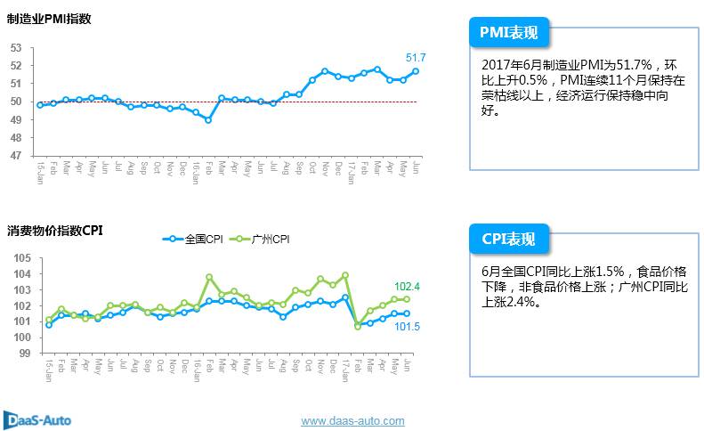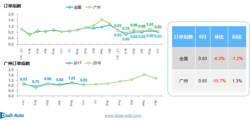 达示数据发布的《2017年6月广州汽车市场观察简报》主要从2017年6月广州汽车市场的宏观经济表现、行业政策动态、市场销售表现、市场价格表现、热销车型表现、订单指数、意向指数、库存深度等角度来呈现。
