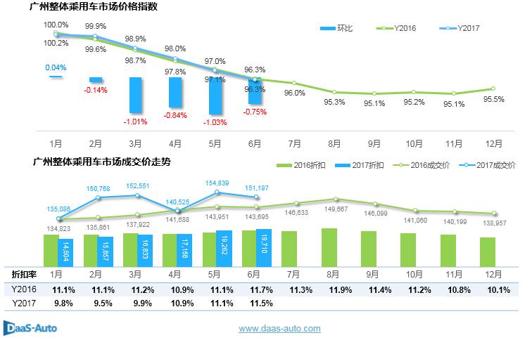 6月,广州整体乘用车价格指数为96.3%,环比下降0.75%;
