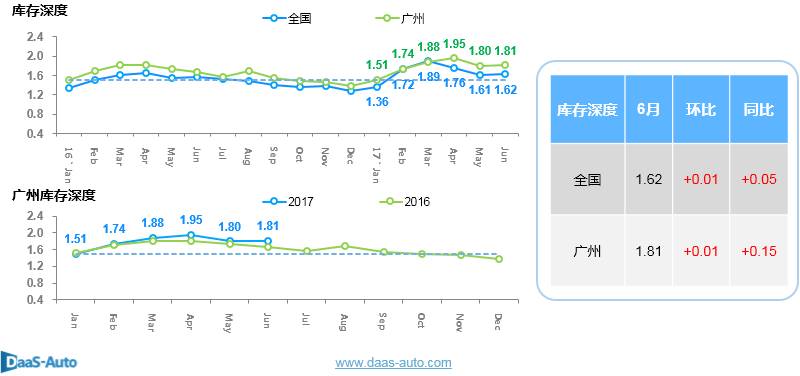6月,全国库存深度为1.62,环比上升0.01,同比上升0.05;