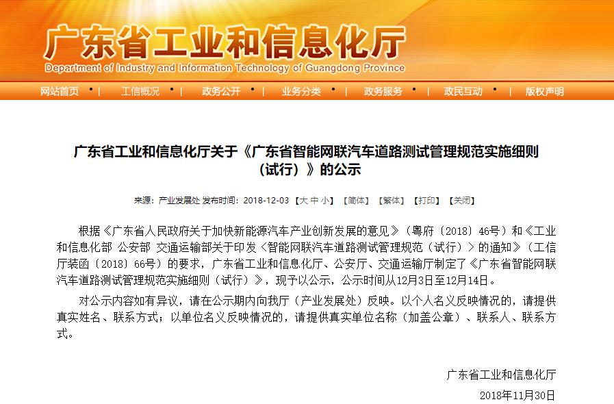 12月3日,广东省工业和信息化厅对《广东省智能网联汽车道路测试管理规范实施细则(试行)》(简称“细则”)进行公示,公示时间从12月3日至12月14日。此前首个国家级自动驾驶路测管理规范已经出台,包括北京、上海、重庆、深圳、长春等省市陆续出台了智能驾驶汽车路测相关法规,未来预计会有越来越多的城市开放智能驾驶道路测试。