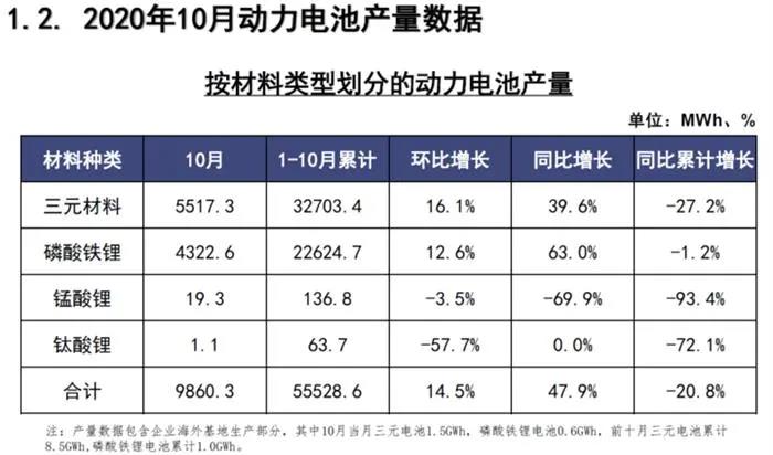 10月,我国动力电池产量共计9.86GWh,同比增长47.9%,环比增长14.5%。其中三元电池产量5.5GWh,占总产量56%,同比增长39.6%,环比增长16.1%;磷酸铁锂电池产量4.3GWh,占总产量43.8%,同比增长63%,环比增长12.6%。