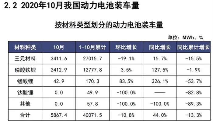 1-10月,我国动力电池产量累计55.5GWh,同比累计下降20.8%。其中三元电池产量累计32.7GWh,占总产量58.9%,同比累计下降27.2%;磷酸铁锂电池产量累计22.6GWh,占总产量40.7%,同比累计下降1.2%。
