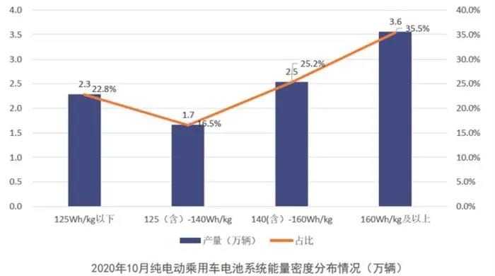 2020年10月,我国纯电动乘用车系统能量密度在125Wh/kg以下和160Wh/kg以上车型产量分别为2.3万辆和3.6万辆,占比分别为22.8%和35.5%,125Wh/kg(含)-140Wh/kg以下车型产量占比达16.5%,较9月份上升7.9个百分点。