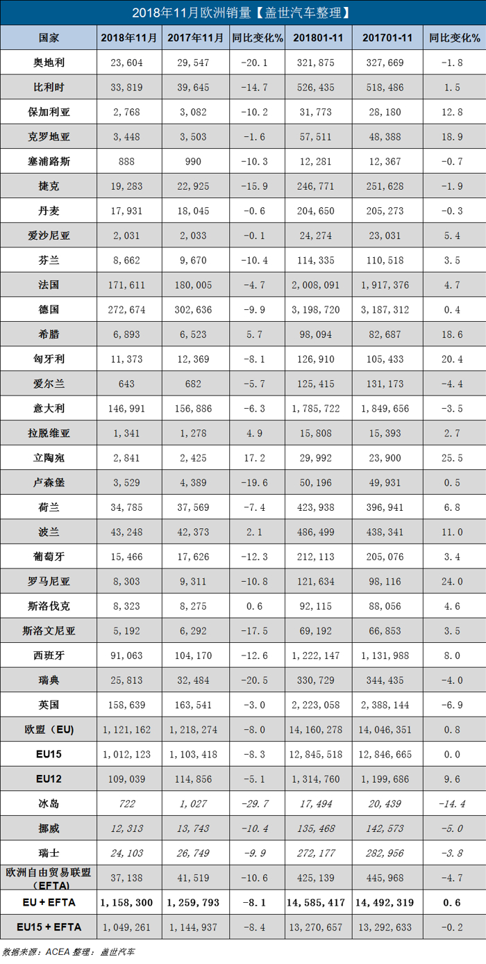 根据欧洲汽车制造商协会(ACEA)发布的数据,2018年11月份,欧洲乘用车市场新车注册量同比下降8.1%至1,158,300辆,连续第三个月出现下跌。在九月份引入新的排放测试(WLTP)之前,一些汽车制造商急于清空库存,导致欧洲八月份汽车注册量大增31.2%,自那之后乘用车需求开始下降。上个月,欧洲大多数国家(包括五大主流市场)的汽车市场继续萎缩。
