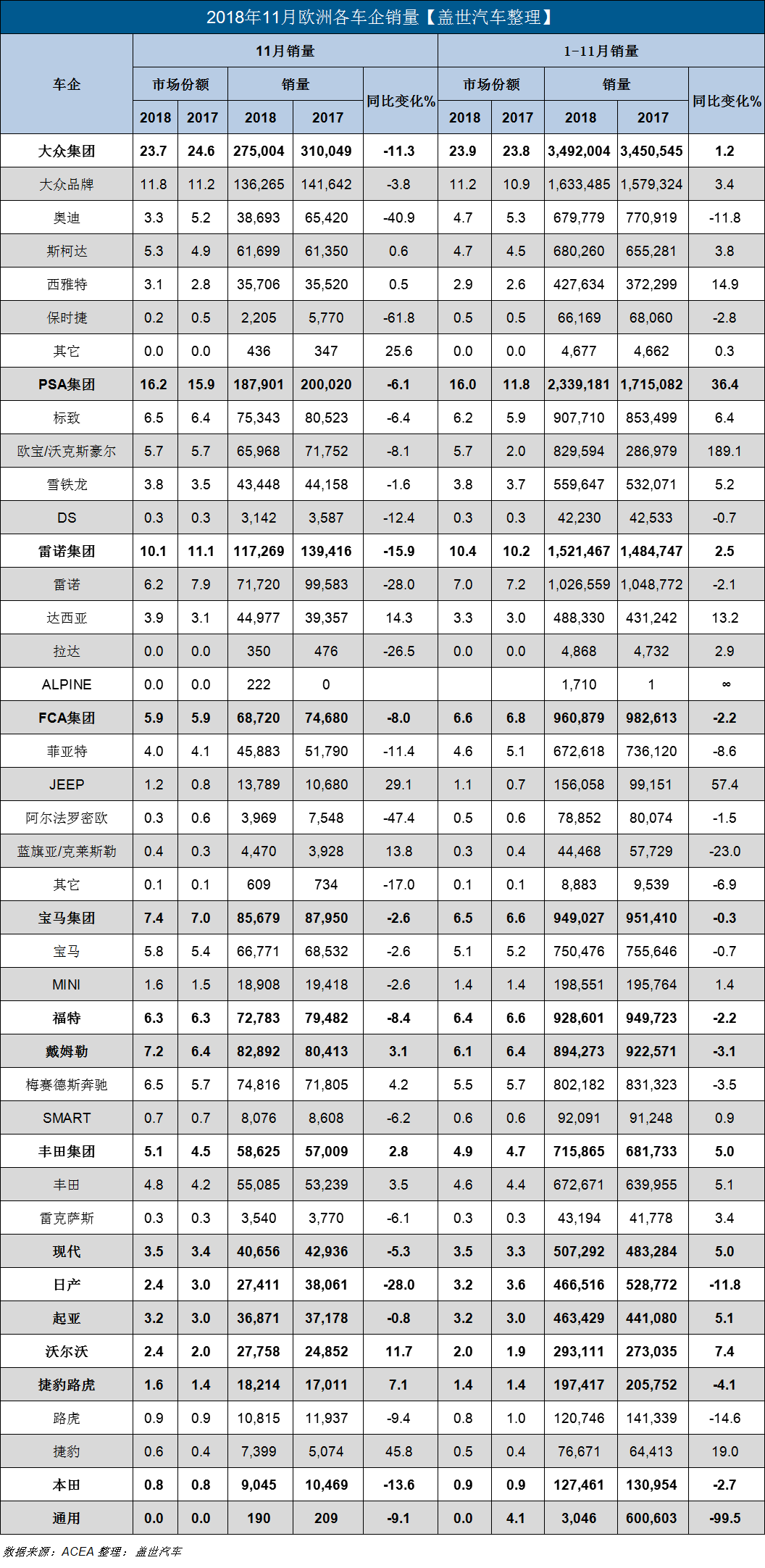 雷诺集团11月份欧洲销量同比下降16%,其旗下品牌雷诺和拉达跌幅分别达28%和26.5%,但达西亚销量却上涨了14.3%;FCA集团上个月在欧洲共售出68,720辆新车,较去年同期下跌8%,这主要因为旗下阿尔法罗密欧和菲亚特品牌的销量分别下跌47%和11%,相比之下,JEEEP品牌销量创下了29%的增幅。另外两大美系品牌福特和通用则分别出现8.4%和9.1%的跌幅。