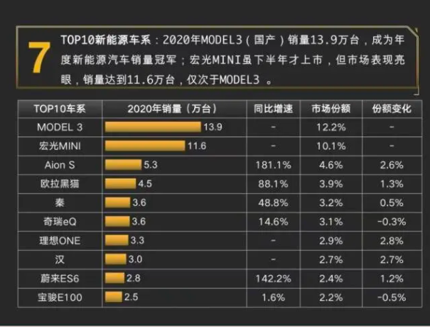 其中,特斯拉Model 3无疑成为最大的赢家,上险量达13.9万台,市场份额12.2%,位居第一。最大的“黑马”则是宏光MINI,一路直追特斯拉,2020年上险量达11.6万辆。考虑到这款车型去年下半年才正式上市,新车表现十分亮眼。单凭半年业绩,就能快速抢占10.1%的市场份额,形成与特斯拉抗衡的一股“新势力”。另外,Aion S 、欧拉黑猫、比亚迪秦等车销量也可圈可点,但与Model 3、宏光MINI“第一阵营”的销量相比,差距较大。广汽埃安的Aion S上险量达5.3台,同比增速最高,达181.1%,市场份额上涨2.6%,但与第一梯队仍有差距。