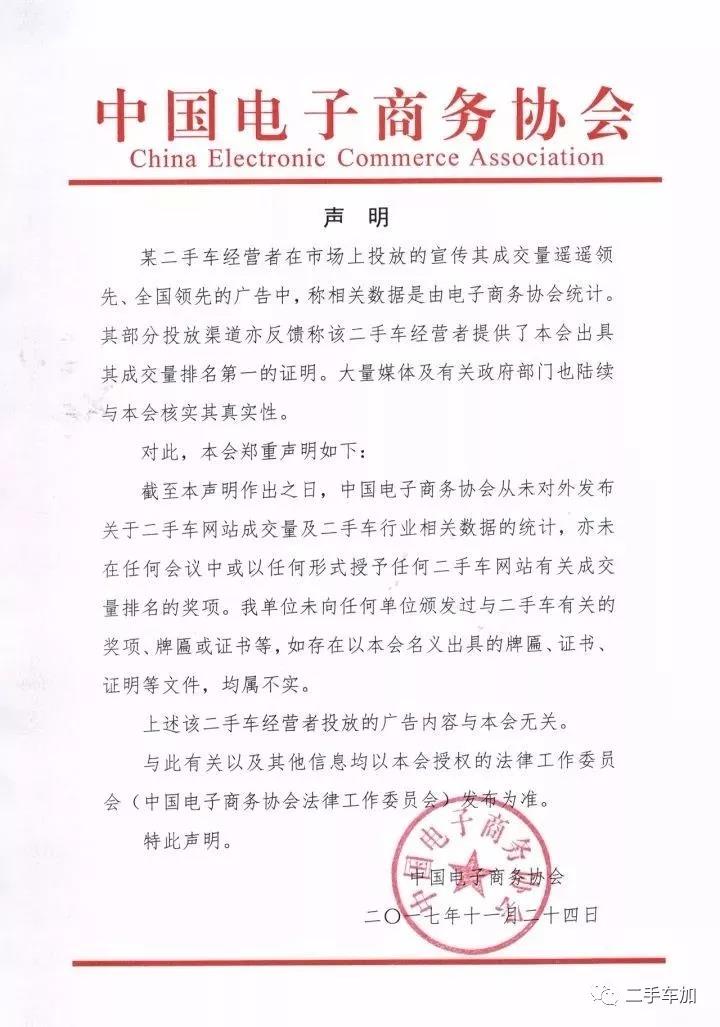 上述声明表明,中国电子商务协会向法院出具的回复原件中,其明确表示该协会并未以自己名义或授权其他机构(包括协会分支机构)对外发布过关于二手车网站成交量、排名、以及其他相关二手车网站的信息,从未授予二手车网站有关成交量排名的奖项,亦从未发布过二手车网站成交量及排名的数据。