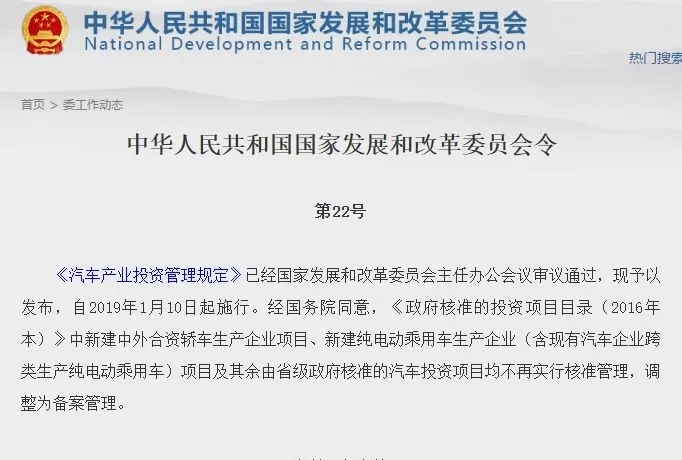 国家发展改革委于2018年12月10日发布第22号令,颁布《汽车产业投资管理规定》,自2019年1月10日起施行。