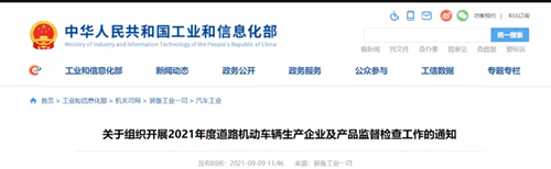 工信部发布《关于组织开展2021年度道路机动车辆生产企业及产品监督检查工作的通知》