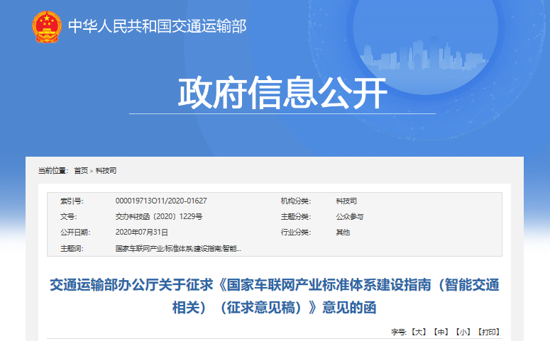 为落实《交通强国建设纲要》,加快自动驾驶和车路协同技术应用,推动国家车联网产业标准体系建设,交通运输部组织编制了《国家车联网产业标准体系建设指南(智能交通相关)(征求意见稿)》(以下简称《指南》),拟联合工业和信息化部、国家标准化管理委员会印发。现将《指南》送你单位,请研提意见并于2020年8月14日前反馈我部。