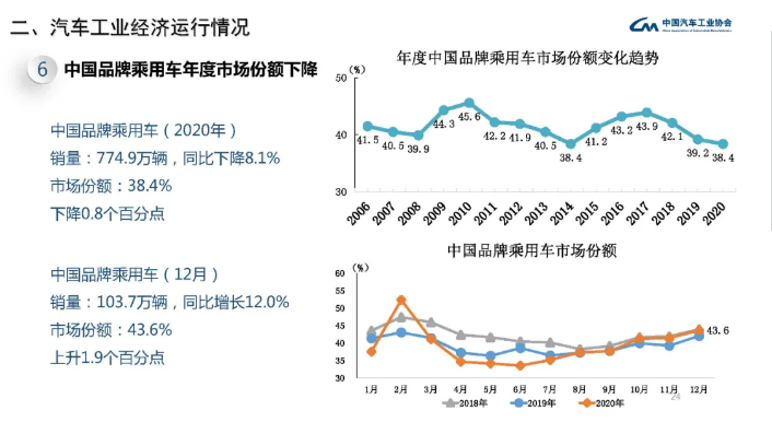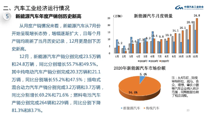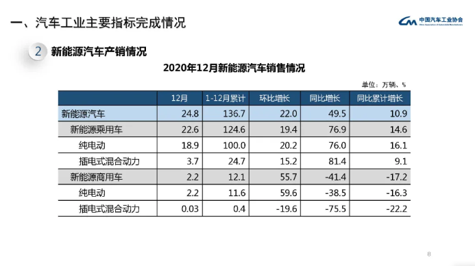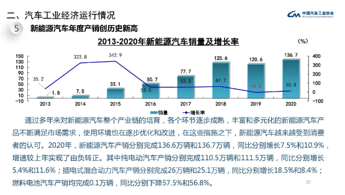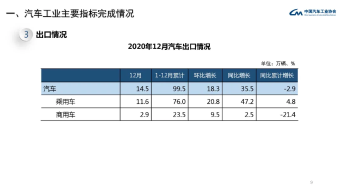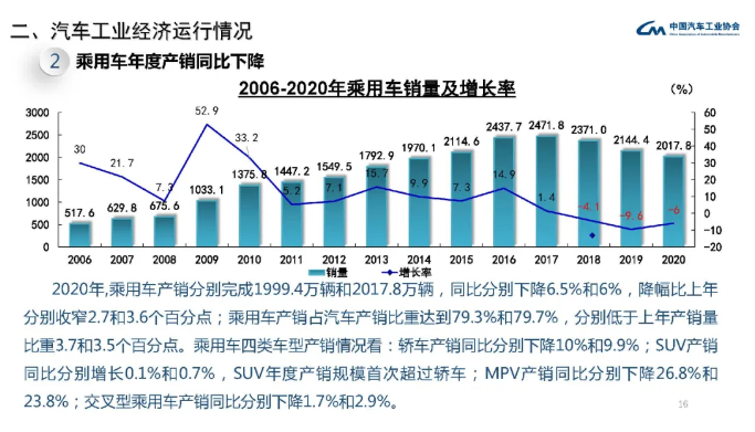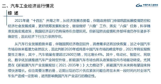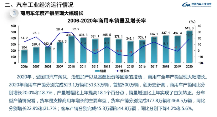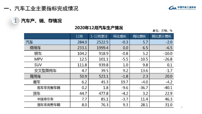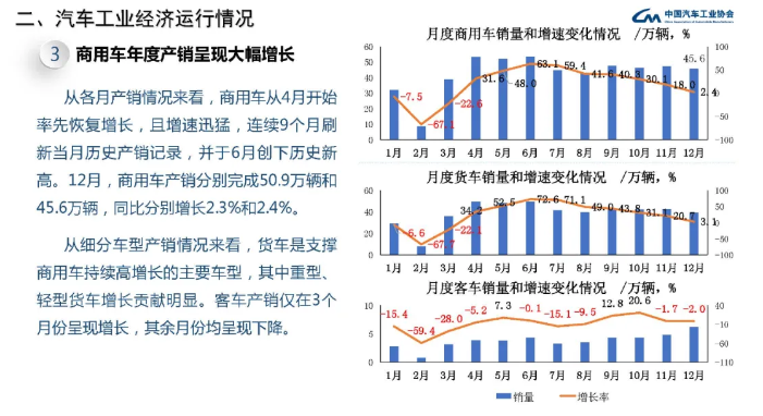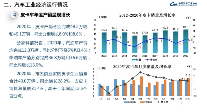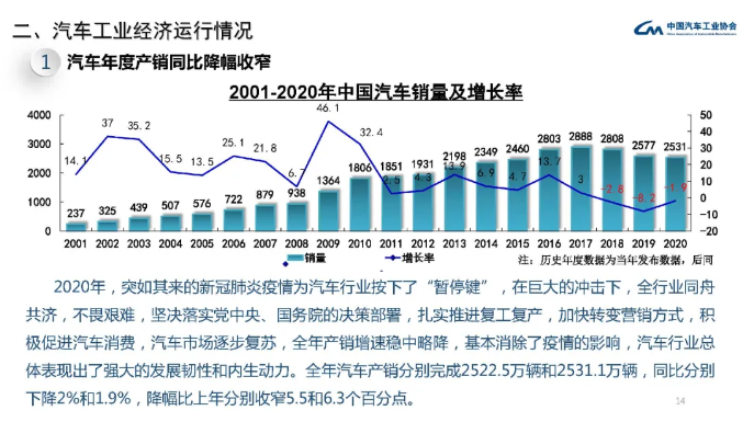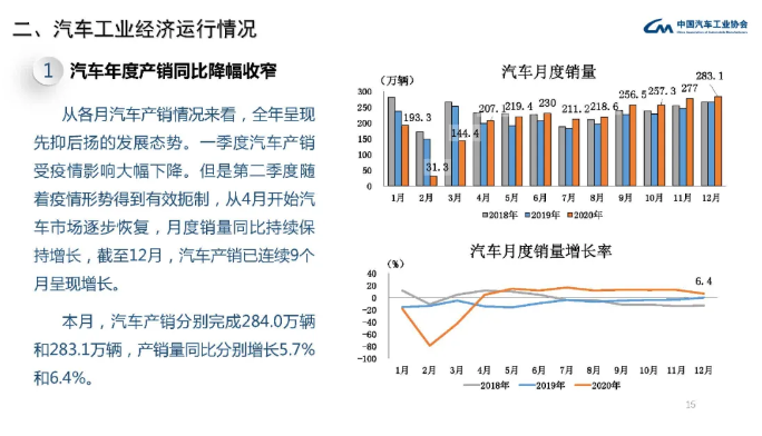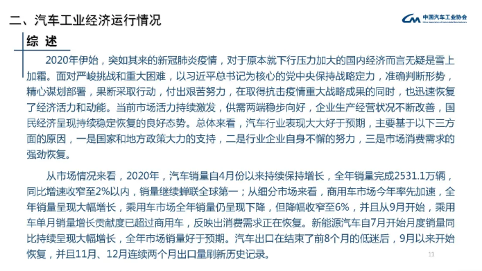 2020年,汽车销量自4月份持续保持增长,全年销量完成2531.1万辆,同比增速收窄至2%以内,继续蝉联全球第一。新能源汽车自7月份月度销量同比持续呈现大幅增长,全年市场销量好于预期。汽车出口在结束了前8个月的低迷后,9月开始恢复,且在11月、12月连续两个月出口量刷新历史记录。