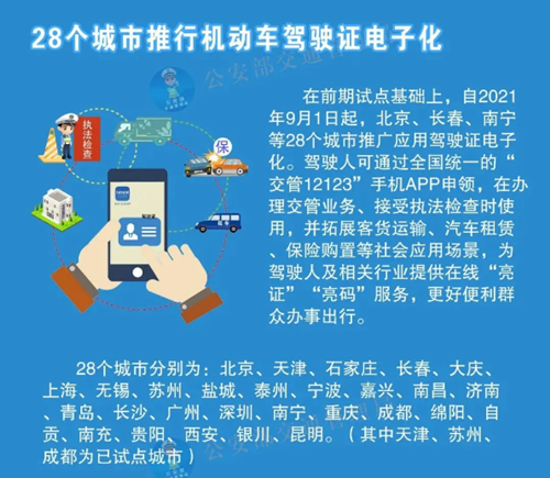 北京等28个城市推行机动车驾驶证电子化。在前期试点基础上,北京、长春、南宁等28个城市推广应用机动车驾驶证电子化。通过全国统一的“交管12123”APP发放电子驾驶证,电子驾驶证在全国范围内有效,办理交管业务、接受执法检查时出示使用,并拓展客货运输、汽车租赁、保险购置等社会应用场景,为驾驶人提供在线“亮证”“亮码”服务,进一步简化办事手续资料,提升证件使用便捷度,更好便利群众办事出行。此后,将陆续在全国范围内分阶段实施。