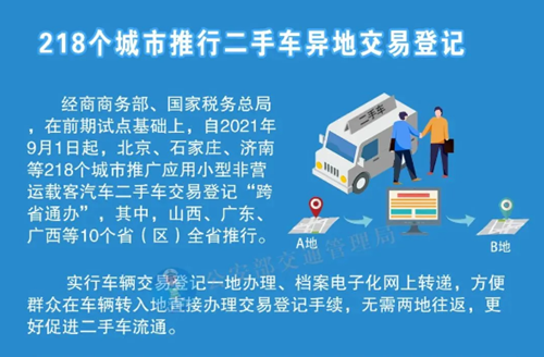 石家庄等218个城市推行二手车异地交易登记。经商务部、国家税务总局,在天津、太原、沈阳、上海等20个城市试点推行小型非营运载客汽车二手车交易登记“跨省通办”基础上,北京、石家庄、济南等218个城市推广应用,其中,山西、广东、广西等10个省(区)全省推行。对二手车需要在异地交易的,实行二手车交易登记一地办理、档案电子化网上转递,实现二手车全国范围内跨省跨市异地交易登记,无需两地往返,更好促进二手车流通。