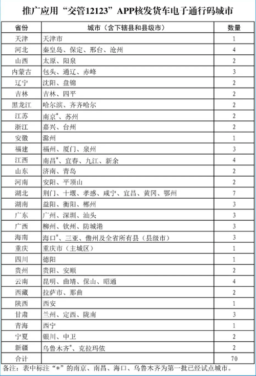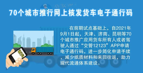 天津等70个城市推行网上核发货车电子通行码。在南京、南昌、海口、乌鲁木齐4个城市试点货车所有人或者驾驶人通过“交管12123”APP申请电子通行码基础上,天津、济南、昆明等70个城市推广应用“交管12123”APP核发货车电子通行码,进一步简化申请手续,减少纸质材料和来回往返,助力现代流通体系建设。