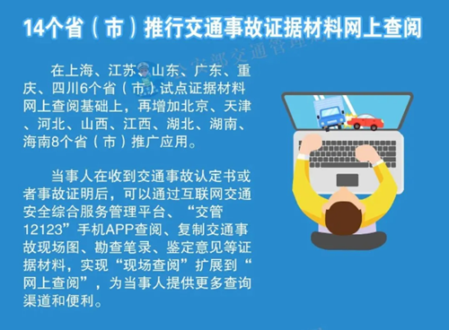 河北等14个省(市)推行交通事故证据材料网上查阅。在上海、江苏、山东、广东、重庆、四川6个省(市)试点证据材料网上查阅基础上,再增加北京、天津、河北、山西、江西、湖北、湖南、海南8个省(市)推广应用。当事人在收到交通事故认定书或者事故证明后,可以通过互联网交通安全综合服务管理平台、“交管12123”APP查阅、复制交通事故现场图、勘查笔录、鉴定意见等证据材料,实现“现场查阅”扩展到“网上查阅”,为当事人提供更多查询渠道和便利。