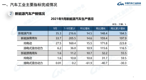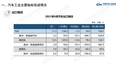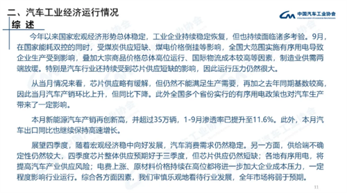 据中国汽车工业协会统计分析,2021年9月,芯片供应略有缓解,但仍然不能满足生产需要,再加之去年同期基数较高,因此当月汽车产销环比上升,但同比下降。此外全国多个省份实行的有序用电政策也对汽车生产带来了一定影响。本月新能源汽车产销再创新高,并超过35万辆,1-9月渗透率已提升至11.6%。此外,本月汽车出口同比也继续保持高速增长。