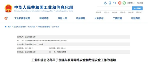 工信部发布《工业和信息化部关于加强车联网网络安全和数据安全工作的通知》