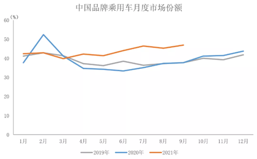 2021年9月,中国品牌乘用车销售82.1万辆,环比增长16.7%,同比增长3.7%,占乘用车销售总量的46.9%,占有率比上月提升1.6个百分点,比上年同期提升9.1个百分点。