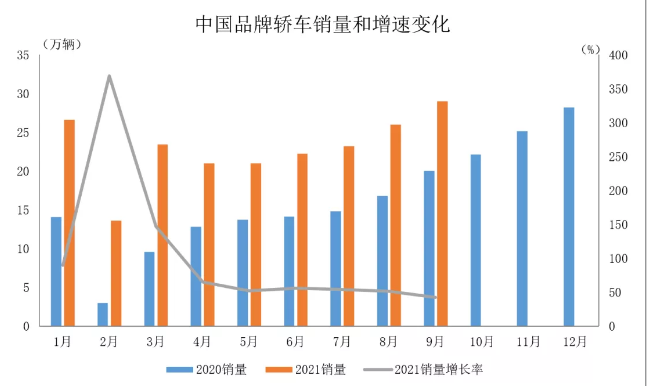 据中国汽车工业协会统计分析,2021年9月,中国品牌乘用车销量环比呈较快增长,同比增速略低,总体表现好于乘用车行业。