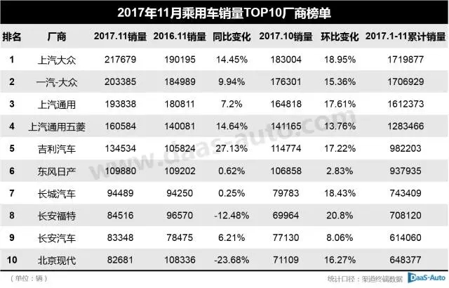 在2017年最后的一个月里,达示数据及时针对厂商、车型、城市和新能源汽车的销售表现,整理出TOP10销量榜单,并作一简析。